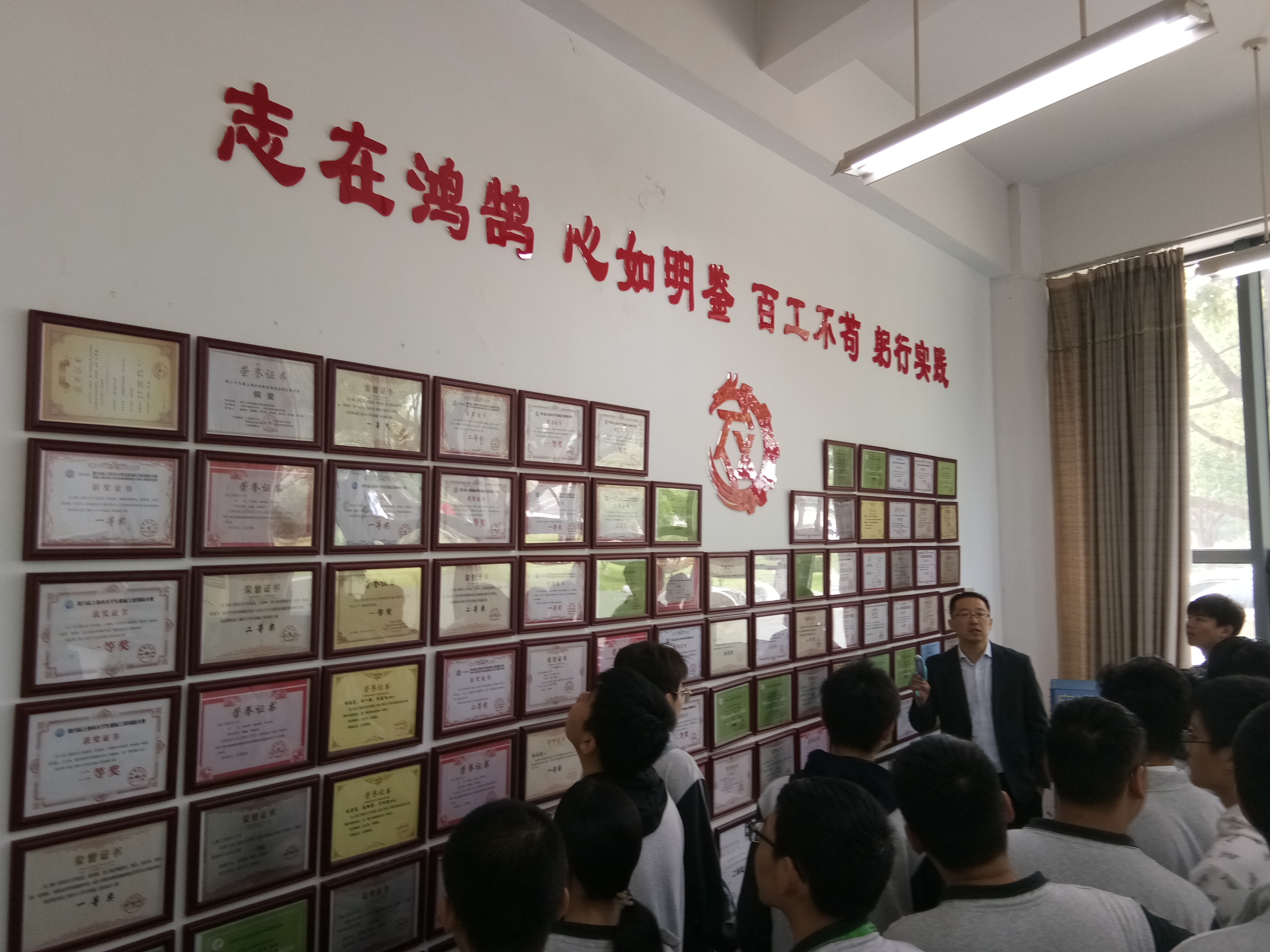 在学院机械创新基地的荣誉室里,同学们盯住荣誉墙看呆了:墙上齐刷刷地挂满了学校、学院、学生获得的各种奖状,真是“琳琅满目”,令人眼花缭乱。这面荣誉墙就是一面镜子,彰显的是气质,比拼的是实力。两个多小时,美丽的初见短暂而甜蜜,同学们依恋不舍地离开了校园。这次相见,他们添注了活力,激发了热情,坚定了梦想。他们不愿停留在今日的“一见钟情”,也不满足于他日偶然的碰面,而是决心历练3年,期待今后能与“她”有4年的朝夕相伴。