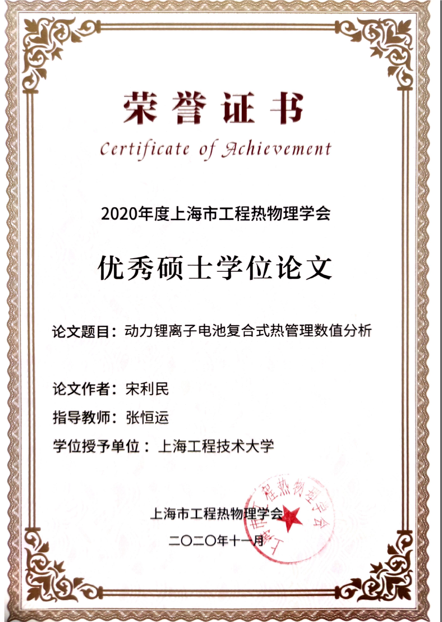 上海市工程热物理学会第九届会员代表大会于2020年11月29日在上海交通大学召开,会上颁发了2020年度上海市工程热物理学会优秀博士学位论文奖和优秀硕士学位论文奖,永利官网yl7703永利官网宋利民同学的硕士学位论文《动力锂离子电池复合式热管理数值分析》,荣获学会优秀硕士学位论文奖,指导老师为张恒运教授。本届参评论文为2018年1月1日至2020年6月30日获得博士硕士学位者的学位论文。