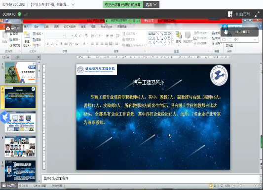 yl7703永利官网为增进学员对我院特色专业的了解,分别在8月30日下午和9月3日上午,通过华为云会议平台,开展了学科与专业介绍的活动。由朱姿娜老师介绍了机电专业的详细情况;苗晓丹老师介绍了智能制造的详细情况;任红娟老师介绍了汽车工程系和汽车服务工程系的基本情况。活动内容主要包括学科与专业的建设情况、招生情况、科研团队的情况以及导师的详细信息介绍。通过两场学科与专业的介绍,加深了学员对我院建设的印象,促进了新生对学院及导师情况的了解。