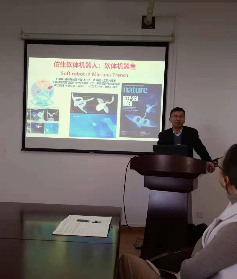 接着,曲教授围绕自己课题组的科研工作进行了学术报告。曲教授分别介绍了软物质、智能软材料及面向国家重大需求和面向人民生命健康的软体机器和微型机器人方面的相关工作,并分享了智能材料设计与制造技术。与此同时简介了所做工作的相关理论支撑,并展示已取得的一些重要成果和进展,随后做了一些展望,并和与会师生开展了热烈的互动交流,给大家留下了深刻的印象和启发,是一场有高度、接地气、干货满满的精彩讲座。
