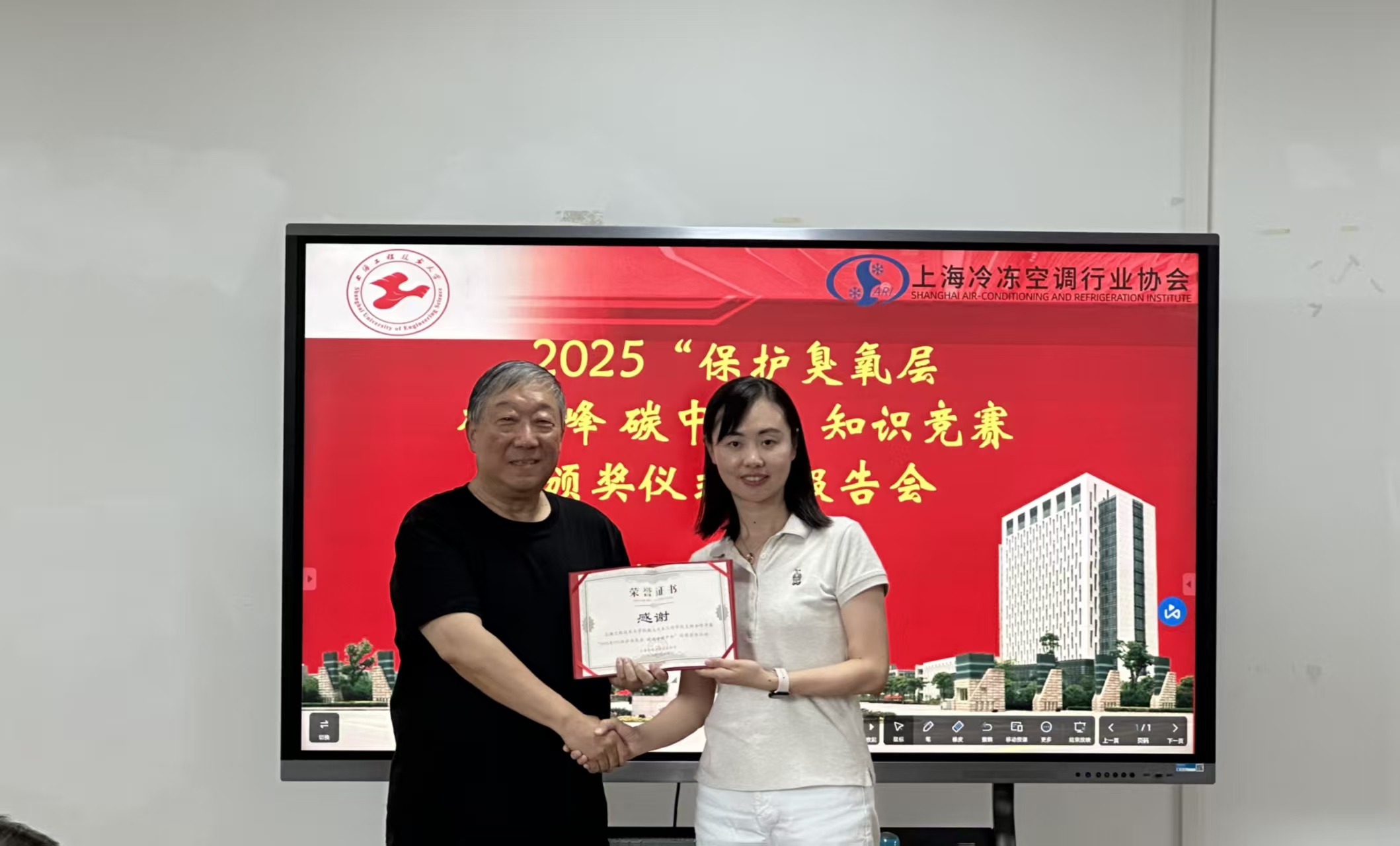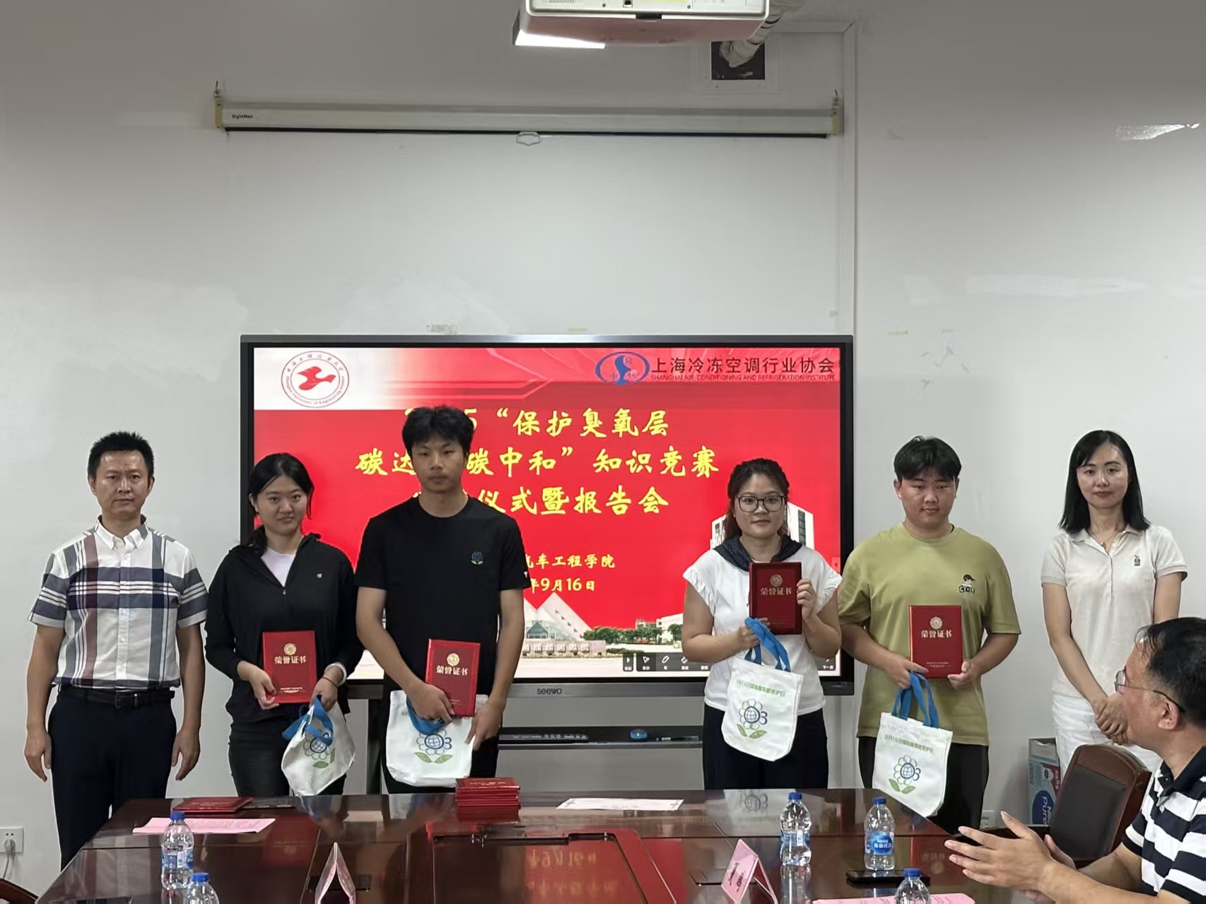 为普及环保知识,传播生态文明理念,9月16日,由上海市生态环境局固体废物与化学品管理技术中心指导、上海冷冻空调行业协会与永利官网yl7703永利官网联合主办的“2025年‘保护臭氧层、碳达峰、碳中和’知识竞赛颁奖仪式暨报告会”在交通楼举行。上海市生态环境局固化中心科长陆荣华,上海冷冻空调行业协会秘书长邵乃宇、副秘书长龚青伟,国家级培训中心讲师、世界技能大赛上海教练施伟华,学院党委副书记黄中子,邓胜祥、夏鹏等师生代表参加活动。