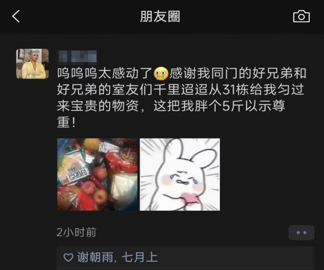 当天晚上7点,裘立行老师告知程耀天,通过协调他们找到了一位热心的宿管阿姨帮忙运送的物资。晚上8点,这位热心阿姨(同学们亲切地称呼她为“大阿姐”)从程耀天的手中接过了这份沉沉的物资,做好消杀工作,独自将这份爱心物资从31栋背至19栋,交到了19栋受助同学的手里。受助同学将物资中的两个苹果拿给“大阿姐”以示谢意,“大阿姐”笑着拒绝道:“你拿着就行了,你们比较缺东西,阿姨这边不缺的”。事后向裘立行老师表示感谢时,他也表示后勤人员就是时刻为全体师生服务的,为六期学生转运物资、提供生活帮助是他们的职责所在。