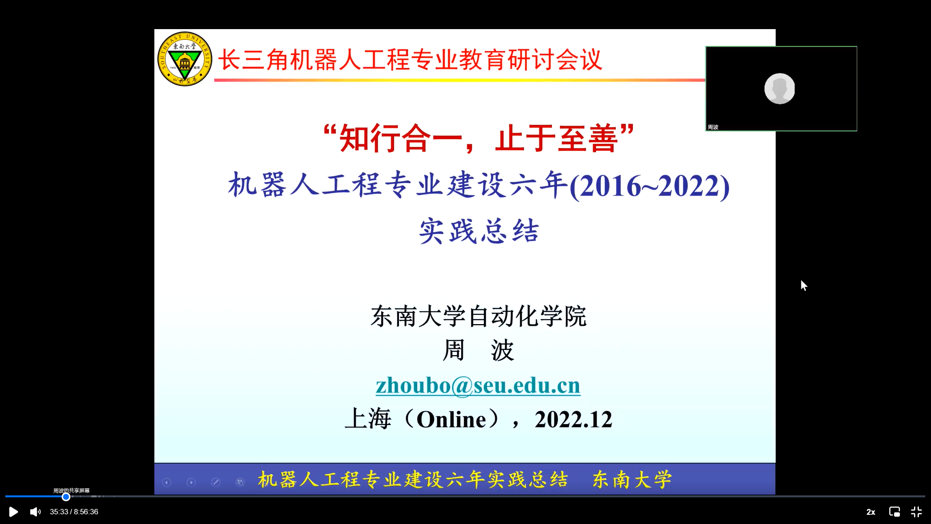 全国首家设立机器人工程本科专业的东南大学自动化学院机器人工程系主任周波副教授做了“知行合一,止于至善”《机器人工程专业建设六年(2016-2022)》实践总结报告。他讲述了机器人工程专业建设的需要与挑战,回顾了国内外机器人工程专业的现状,以及东南大学机器人工程专业建设取得的进展,最后总结机器人工程专业建设中存在问题以及一些思考。