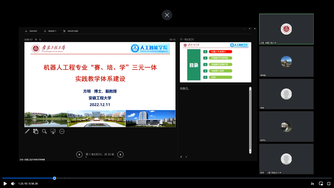 安徽工程大学机械工程学院(人工智能学院)方明副教授报告的题目为《机器人工程专业“赛、培、学”三元一体实践教学体系建设》,他详细介绍了安徽工程大学机器人工程专业实践教学体系的构建、实践教学资源的打造以及实践育人的成效等,充分说明了实践教学在机器人工程专业课程体系中的重要性。