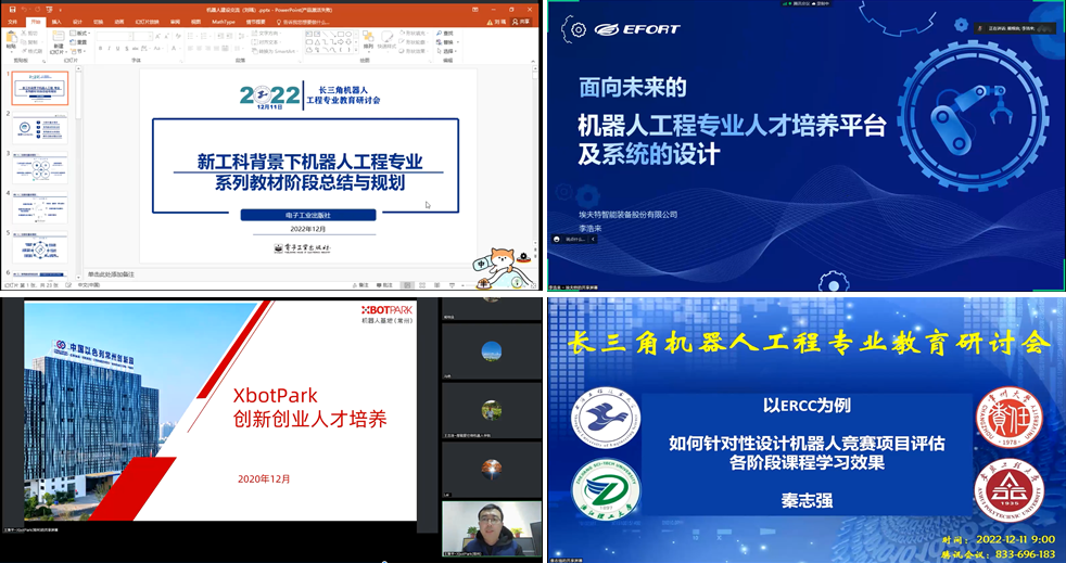 此外,埃夫特中央研究院R2研究中心李浩来研发总监、XbotPark(常州)基地负责人、中以科创学院副院长王豫平、全童科教有限公司秦志强董事长、电子工业出版社高等教育分社刘瑀责任编辑等分别从企业和出版社的角度分别做了《面向未来的机器人工程专业人才培养平台及系统的设计》、《机器人工程专业创新创业人才的培养》、《如何针对性设计机器人竞赛项目评估各阶段课程学习效果——以ERCC为例》、《新工科背景下机器人工程专业系列教材阶段总结与规划》的报告。