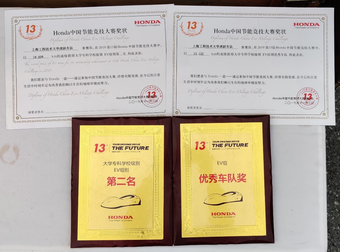 2019年10月31日至11月3日,在广东肇庆国际赛车场举办2019Honda中国节能竞技大赛,期间共有来自全国的高校和企业的66支电车(EV)代表队和70支燃油(EP)代表队。经过激烈角逐,永利官网yl7703永利官网虎跃车队获得佳绩,以18608km成绩获得EV组别第二名,并荣获优秀车队奖。