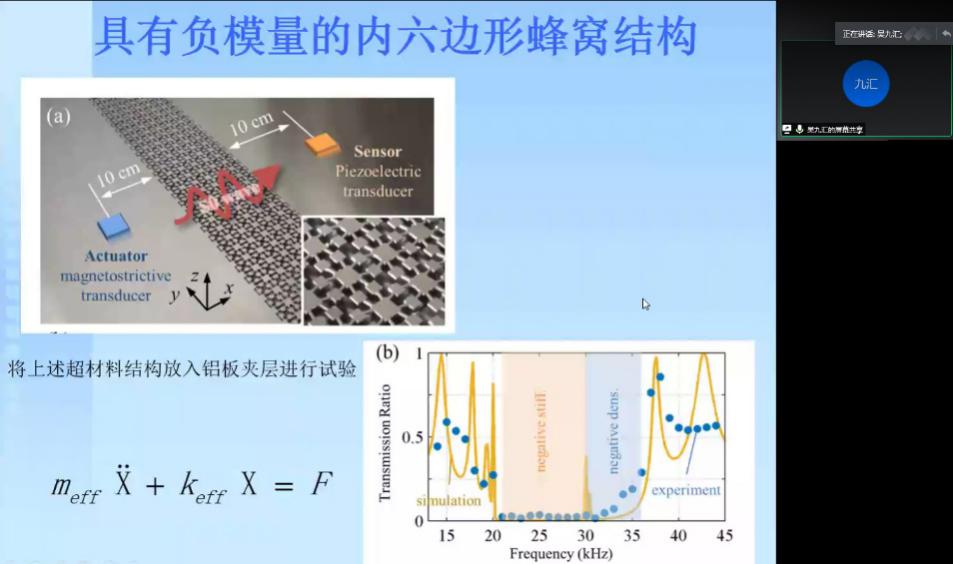 吴教授以深海探测蛟龙号、超音速飞机及高铁等工程应用中噪声与振动的控制为切入点,引出声学超材料在吸声、隔声以及低频宽带的振动控制上的优异特性,对声学超材料以及其工程应用进行了一个全面的介绍。从声子晶体的发展及其三种禁带产生机理出发,讲解了声学超材料的负质量、负模量特性,以及局域共振声学超材料的低频带隙机理及应用;展示了运用Helmholtz共振腔结构、声学虹吸效应、多阶共振单元设计、微穿孔板声质量宽带调控机理,以及全频段高效吸声技术等技术实现小尺寸大宽带吸声的超材料的研究成果;最后探讨了声学超材料在空军、陆军、海军、民用机械以及消声室等专用设备中的广泛应用前景。