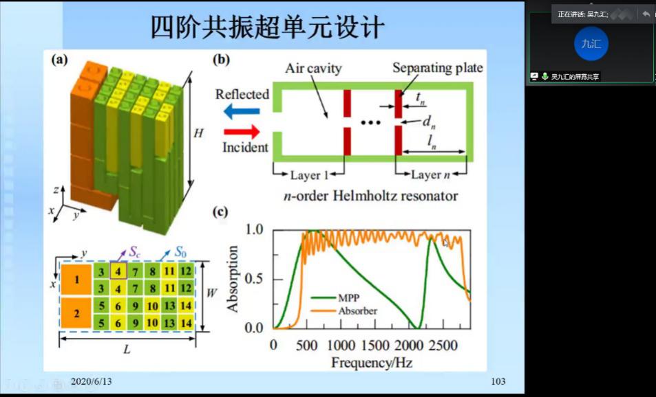 2020年6月13日上午,应yl7703永利官网yl7703永利官网和上海市新能源汽车振动噪声测试与控制专业技术服务平台邀请,西安交通大学教授、博士生导师吴九汇教授做了题为《声学超材料的小尺寸大宽带吸声机理及应用》的视频学术报告,并就研究生提出的学术问题,进行了细致解答和交流。学院副院长、平台副主任郭辉老师代表学院和平台,对吴九汇教授的到来表示了热烈欢迎。